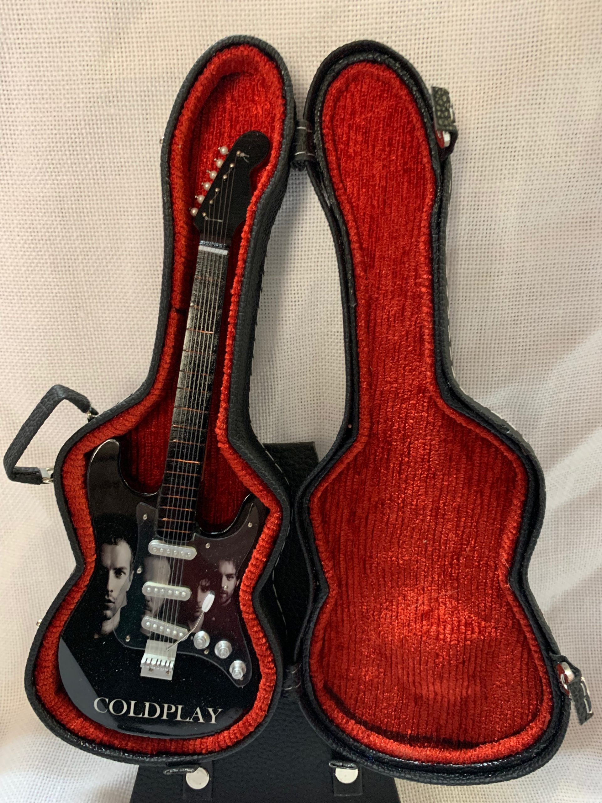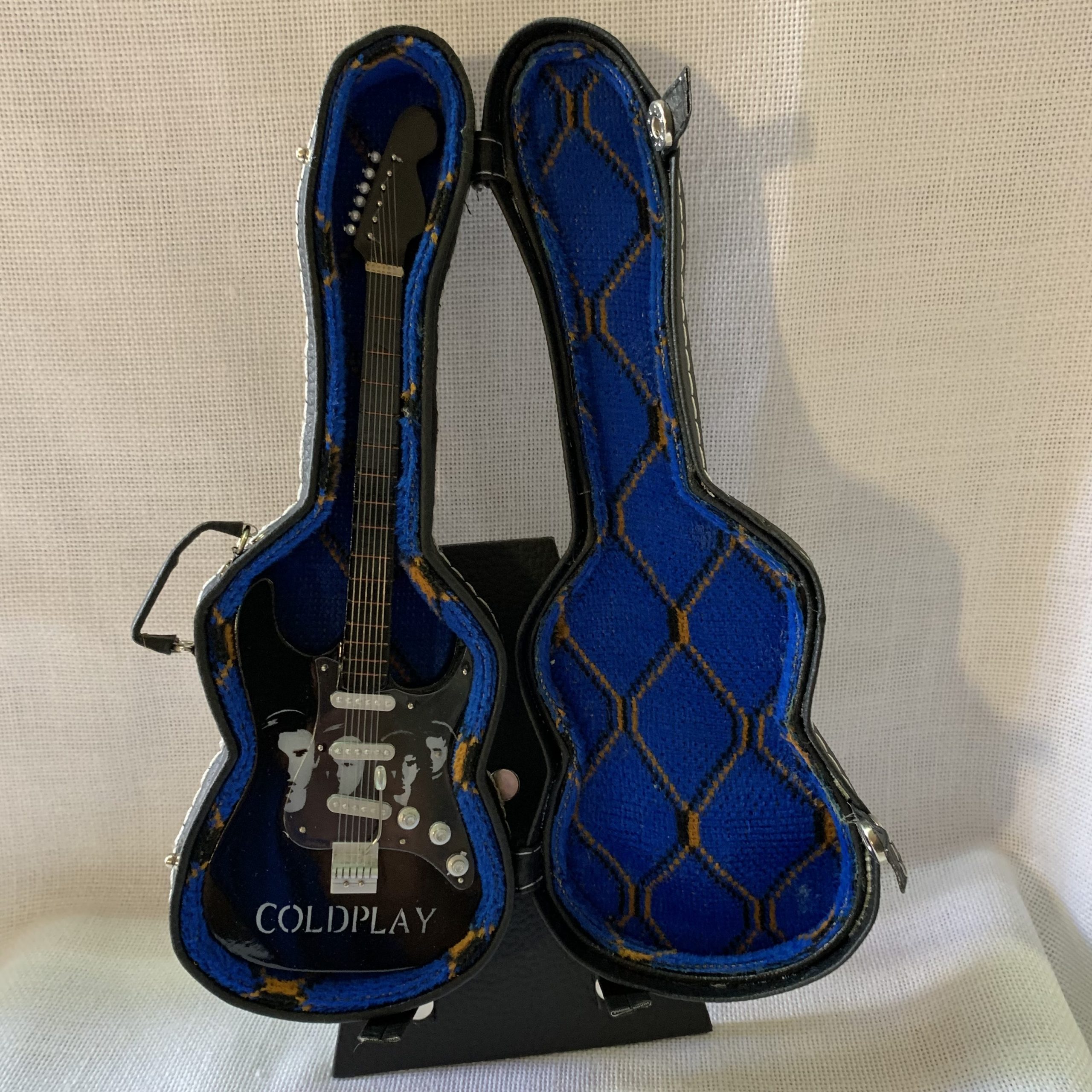 Guitarra con soporte, Guitarra con estuche azul y soporte, Guitarra con estuche rojo y soporte