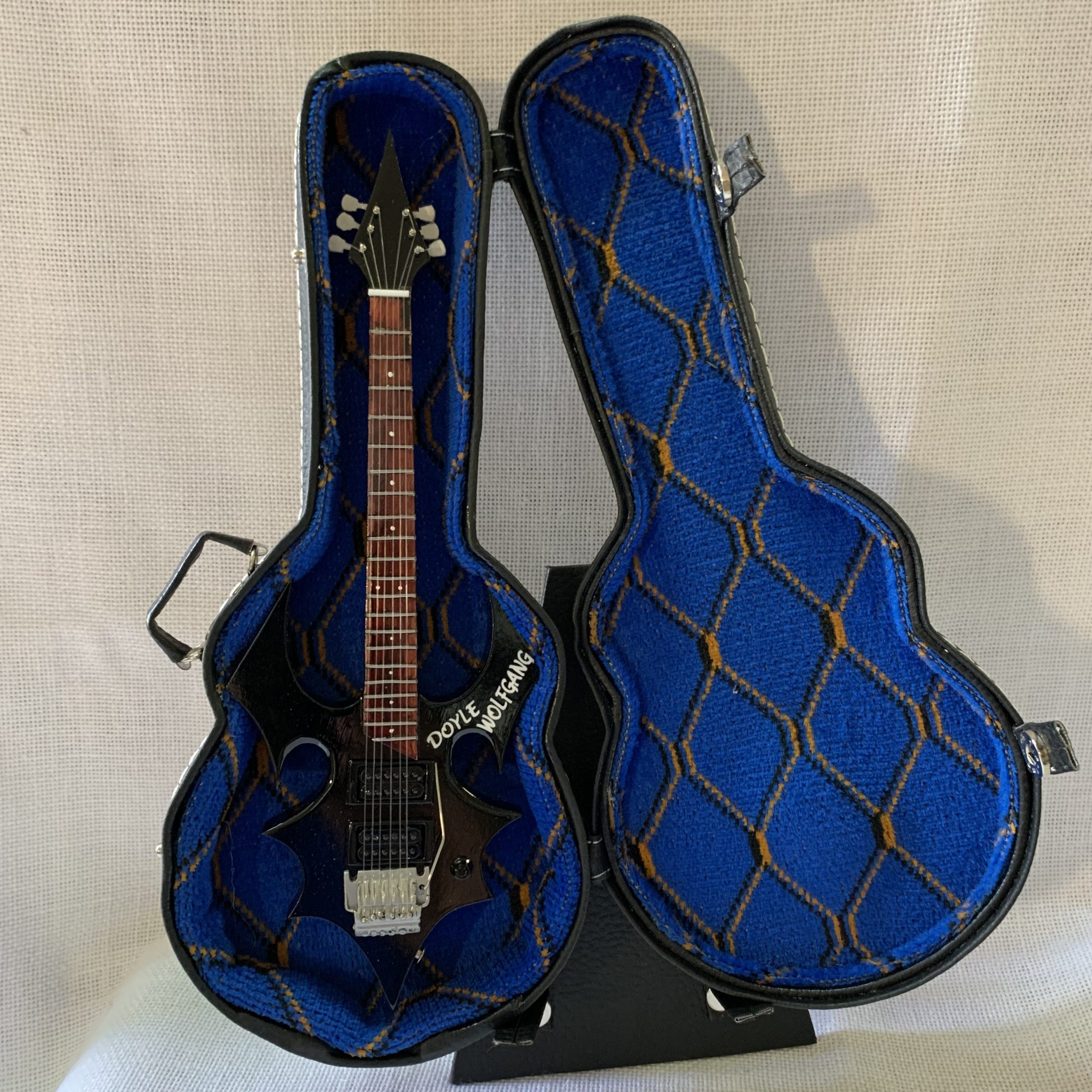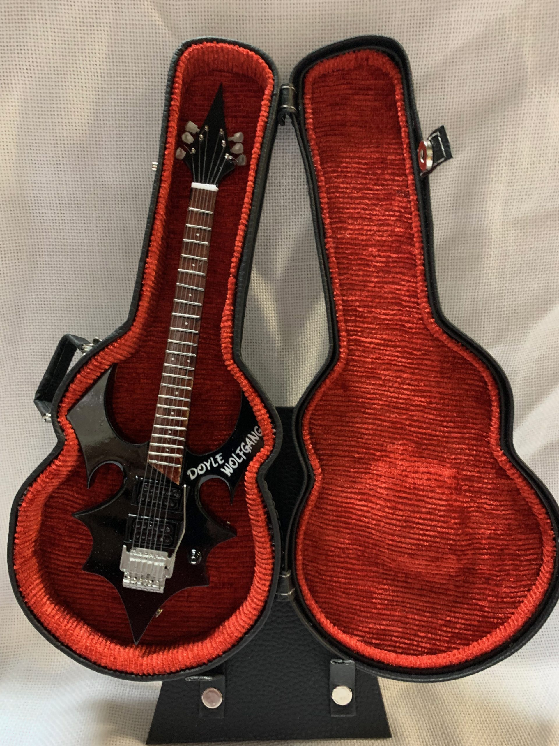 Guitarra con soporte, Guitarra con estuche azul y soporte, Guitarra con estuche rojo y soporte