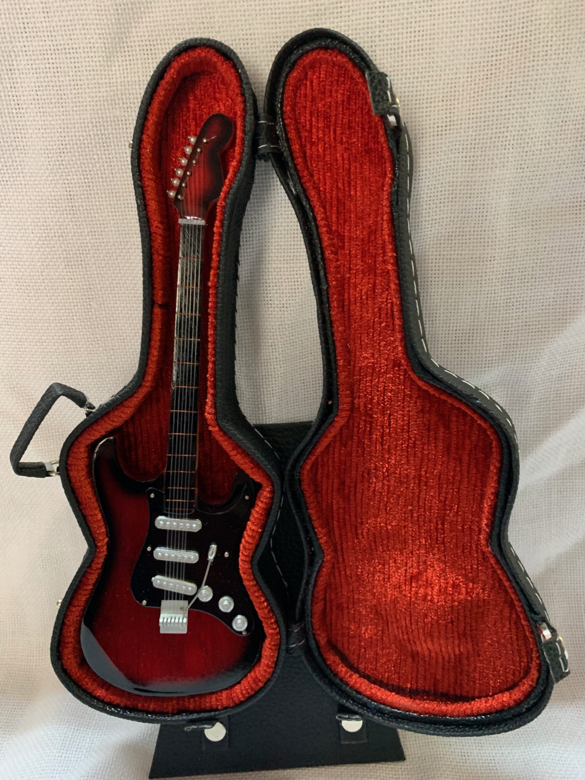 Guitarra con soporte, Guitarra con estuche azul y soporte, Guitarra con estuche rojo y soporte